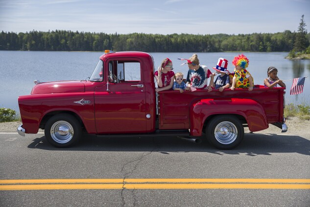 Children sit in the back of a classic truck as they await the start of the 4th of July parade through downtown on July 04, 2019 in Deer Isle, Maine.